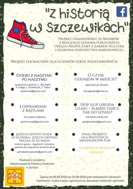 W bezpłatnym projekcie edukacyjnym pn. Z historią w Szczewikach” mogą wziąć udział uczniowie klas 1-8 ze wszystkich żorskich szkół podstawowych. Uczestnicy projektu będą mieli okazję do spotkania z rodowitymi Ślązakami, którzy promują kulturę naszego regionu, wybiorą się na ciekawe wędrówki po Żorach, a także wezmą udział w konkursie gwary śląskiej i spróbują swych sił w tradycyjnych śląskich tańcach.