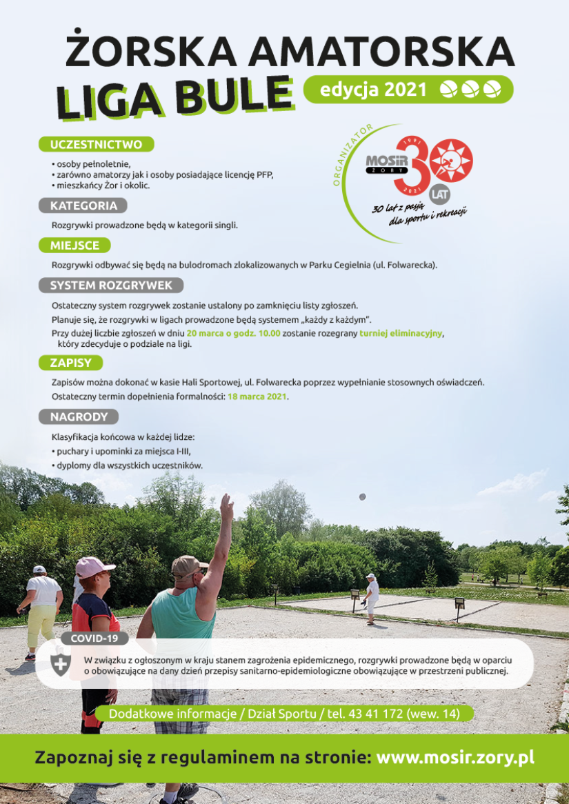 Wiosna zbliża się wielkimi krokami, a wraz z jej nadejściem pojawiła się możliwość uprawiania amatorskiego sportu na świeżym powietrzu. Miejski Ośrodek Sportu i Rekreacji w Żorach korzysta z okazji i już dziś zaprasza miłośników gry w bule do wzięcia udziału w rozgrywkach Żorskiej Amatorskiej Ligi Bule”.