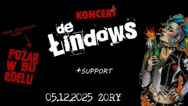 Zaproszenie na koncert zespołu De Łindows w Żorach w ramach trasy promującej ich najnowszy album “Pożar w burdelu”. Grupa wraca do miasta po wcześniejszym występie na lokalnym festiwalu, gdzie zdobyła nagrodę publiczności, i tym razem zapowiada prezentację materiału z siódmej płyty oraz przekrojowy set z dwudziestoletniej działalności.